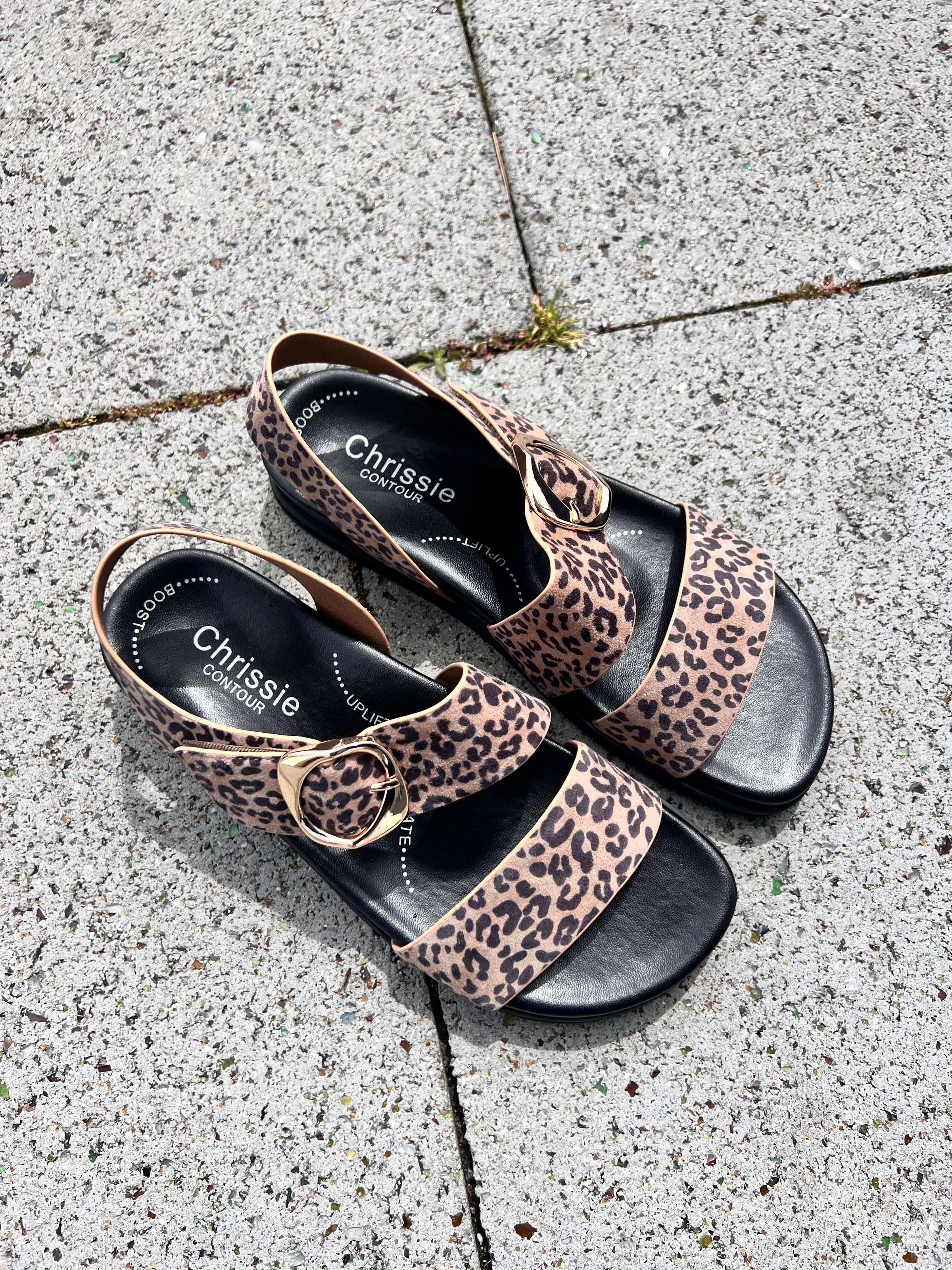 Add a touch of bold style to everyday comfort with  Chrissie sandals.  These leopard-print sandals feature wide crossover straps with a statement gold buckle and a softly contoured footbed for all-day support. The slingback design ensures a secure fit, while the neutral animal print adds effortless flair to any outfit — from casual denim to summer dresses.