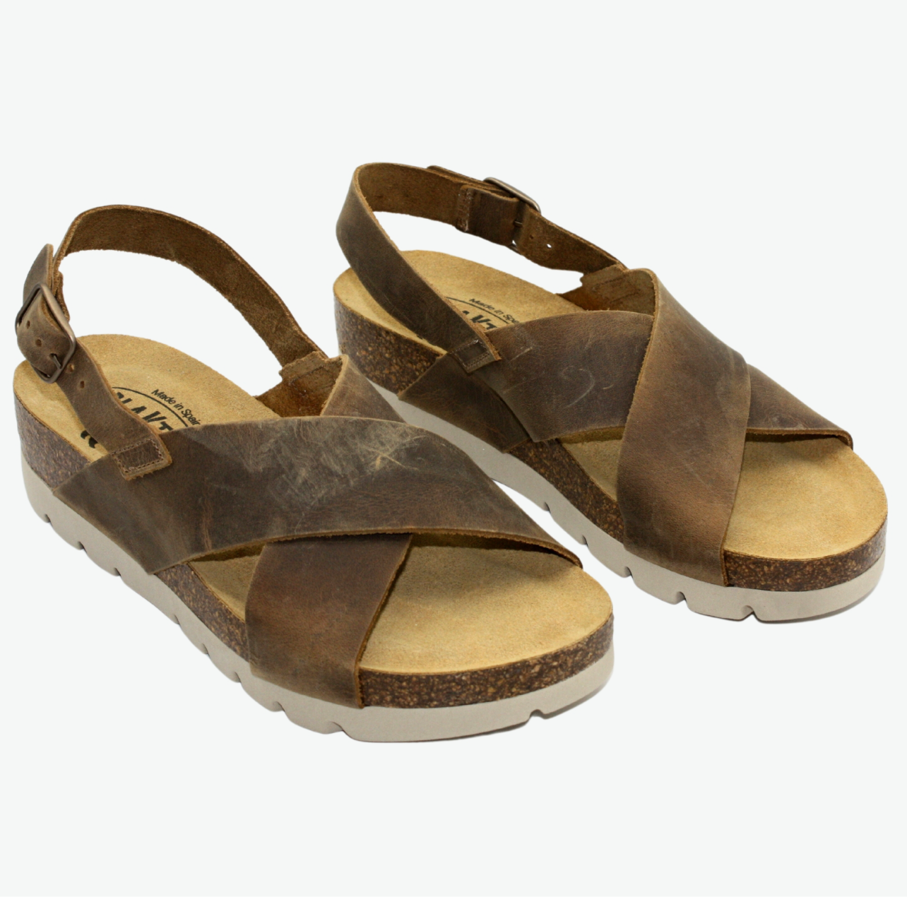 A stylishly comfortable sandal in tan leather from Plakton with a moulded footbed made from sustainable cork and a white rubber sole made with EVA technology