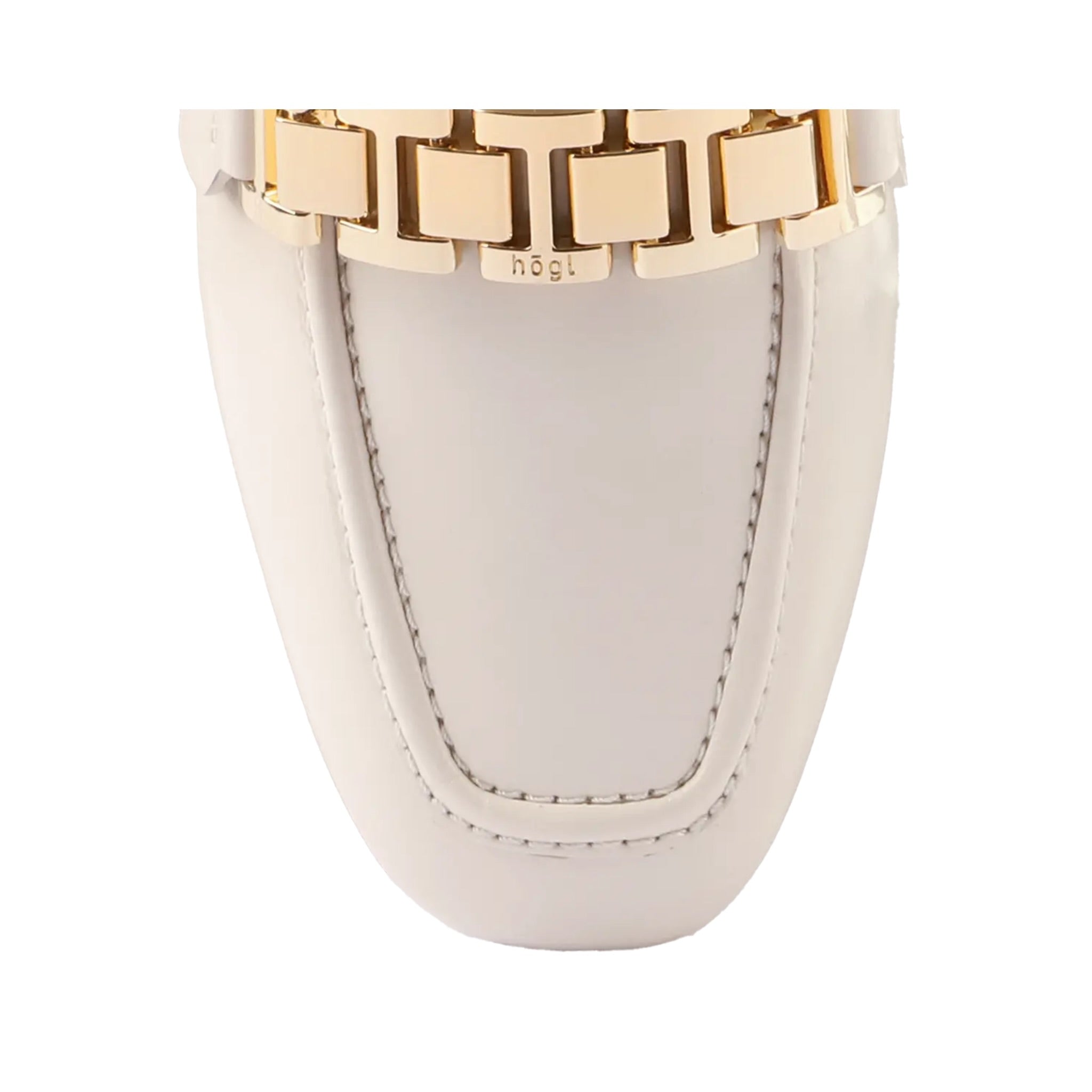 The Högl loafers "Madeleine" combine feminine power with modern elegance. The gold-coloured decorative element was inspired by classic pocket watch chains. The toes and the smart silhouette radiate a timeless charm. The soft leather impresses with a glossy look in classic creme.