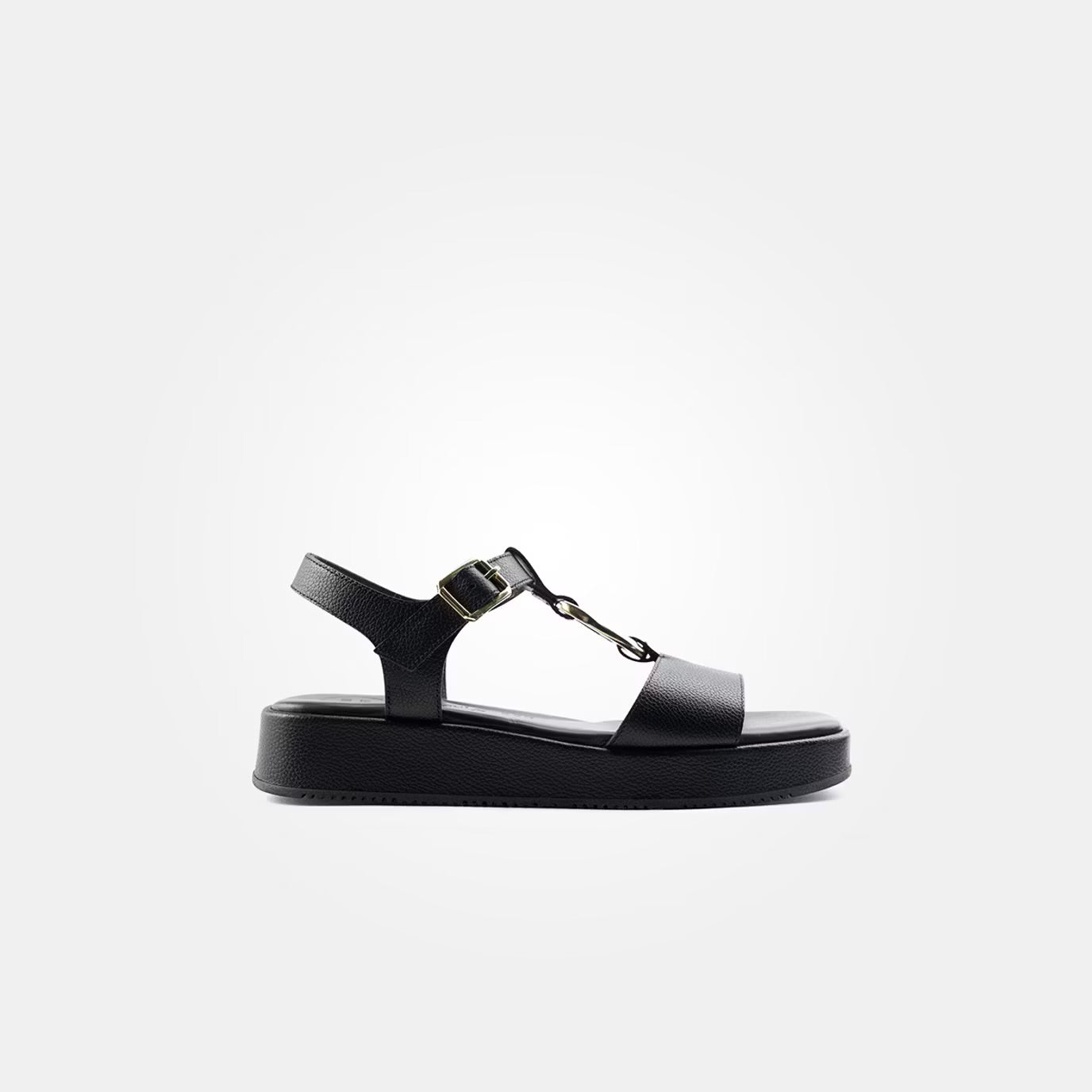 This Paul Green women's sandal is made of black leather with a gold buckle and has an adjustable strap with velcro. The lining and the fixed footbed are made of leather. The sandal has a rubber outsole.