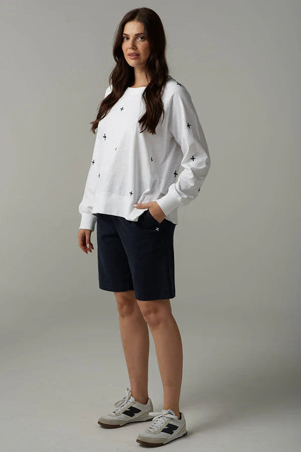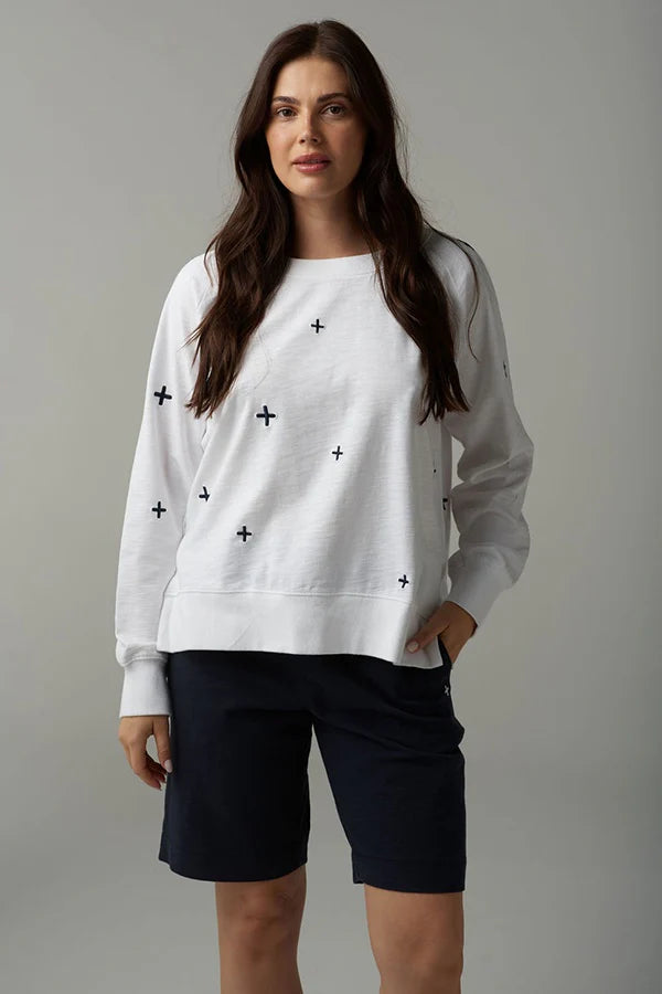 100% Heavy weight cotton slub crew jumper featuring a cross embroided detail on body & sleeves & a side split hem with rib cuffs and base. Perfect lightweight layer for those off duty days