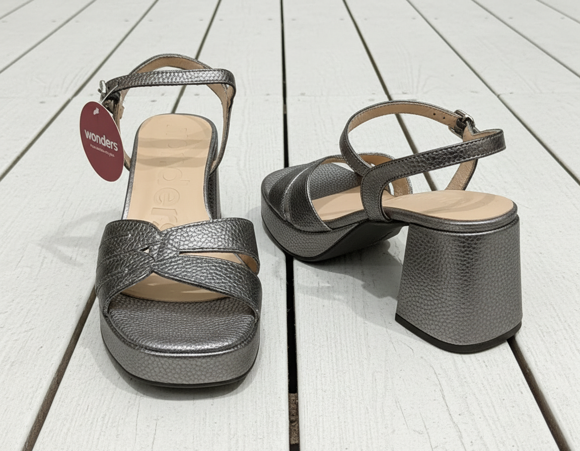 Known for their comfortable styles, this Wonders pewter sandal for evening wear and special occasions will keep you dancing all night long! Ultra comfortable and easy to walk in, featuring a leather upper, wide block heel and memory foam footbed throughout. Adjustable ankle strap, buckle fastening. European sizing. Made in Spain. Leather upper, leather lining, synthetic sole.